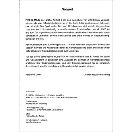 Knüpft an den Band 3 der Violaschule an. Das bereits Gelernte kommt hier in abwechslungsreicher Form zur musikalischen Anwendung und wird auf diese Weise vertieft. Die Musikstücke sind etwas umfangreicher als jene aus der Schule und ermöglichen dem Kind eine breite Palette an Ausdrucksmöglichkeiten.