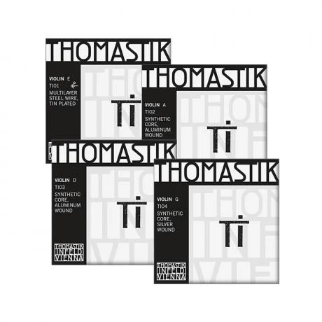 The TI violin strings from Thomastik-Infeld are absolute all-round strings of the highest quality. They are built on a synthetic string core and wound with aluminum or silver. They combine a beautiful, warm sound with an excellent balance between the strings, and are particularly popular with orchestral and chamber musicians. TI strings bring out the tonal possibilities of your instrument. The feeling of playing with the left hand is natural and comfortable. The set also delights with an excellent bow response.